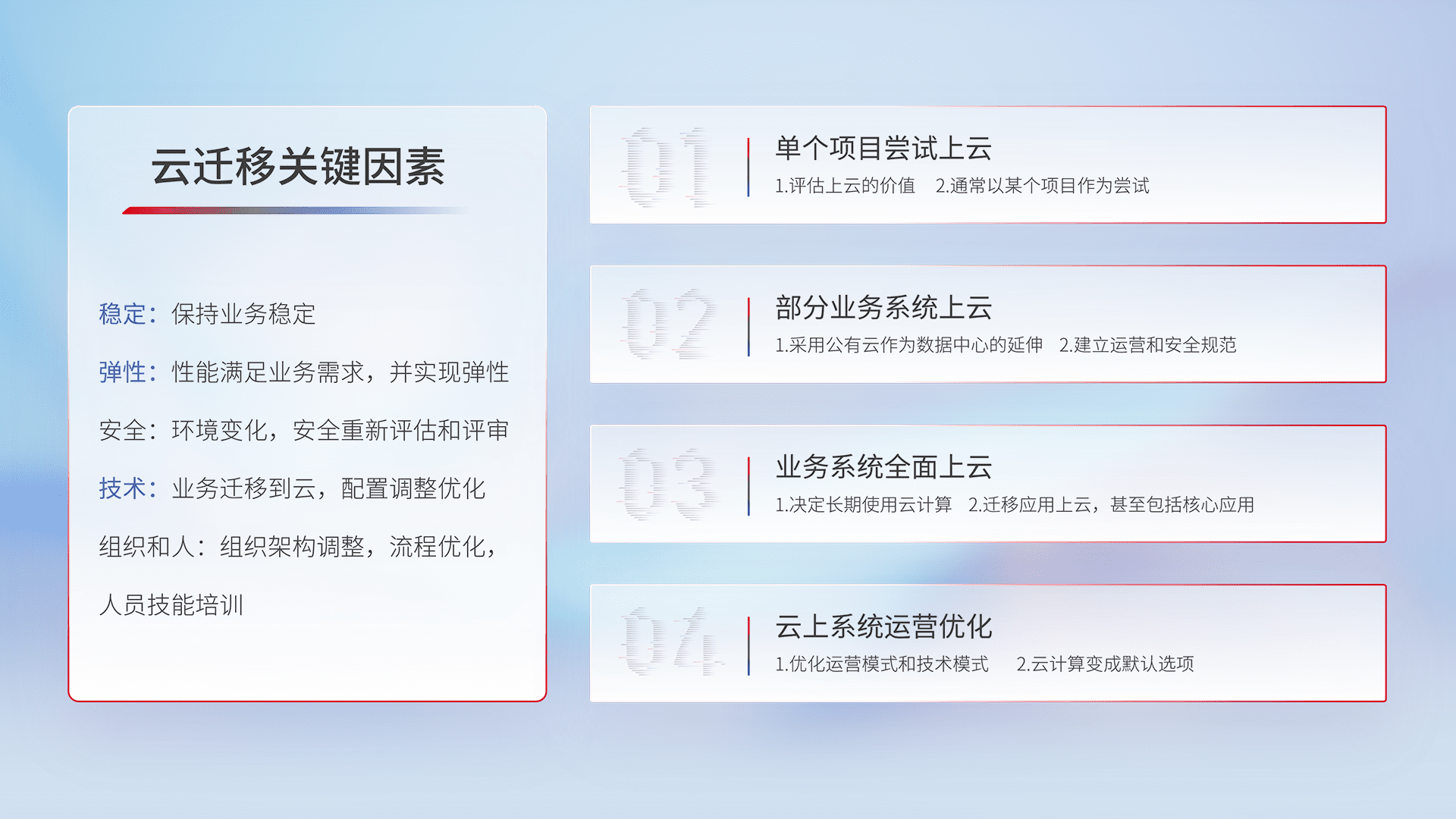 结合实际业务,,,从规划设计、、云平台选型、、、云原生改造、、、、数据迁移、、、集成交付,,,迁移全过程为客户识别最佳上云路径,,,,做好风险识别管理,,设计网络架构、、、身份权限、、、安全审计合规、、、操作审计、、、日志审计、、、监控告警策略、、、多站点容灾设计等,,,,对云上基础设施进行整体规划,,,,提升IT治理水平,,以满足弹性、、、高可用、、高性能的需求。。。