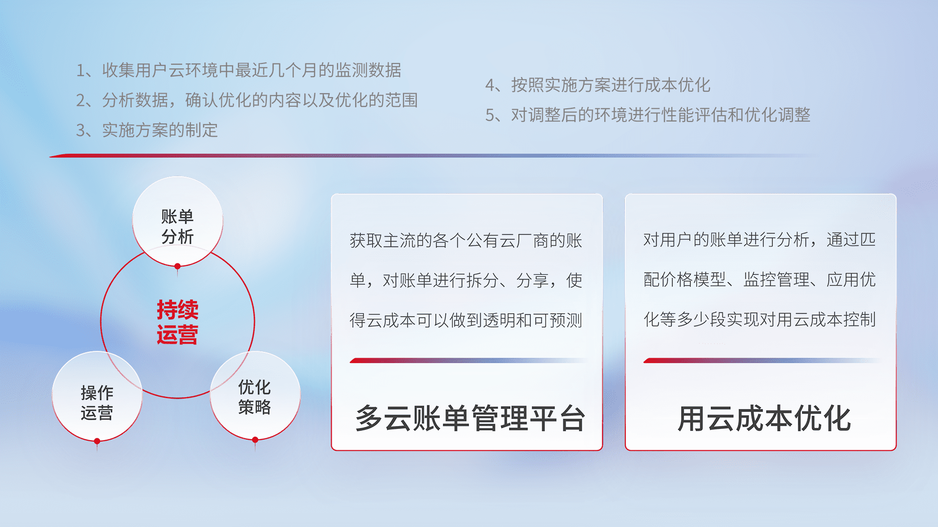 通过多云纳管,,,,以统一的资源数据模型把客户的云资源进行抽象和封装,,,,进而实现对多云资源的统一操作,,保障云资源管理的可靠性、、稳定性与可用性。。。。量身定制化运维内容,,,配置、、、开发运维、、、、补丁管理、、备份、、监控、、、、认证和访问管理、、、审计和日常巡检等,,保障在用云过程中的可靠度,,,稳定度以及高可用率。。